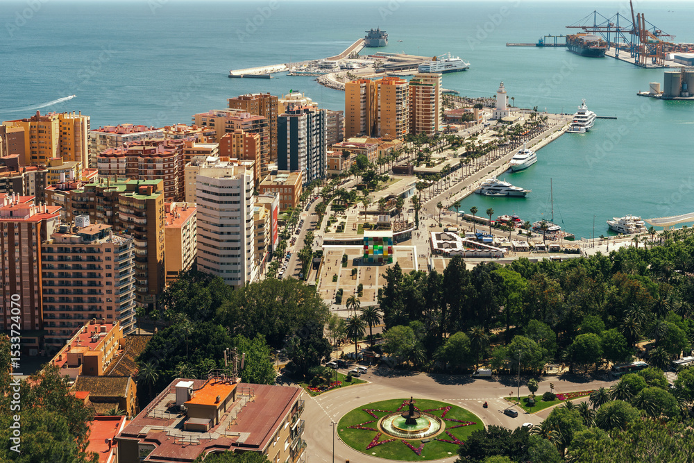 Vibrant coastal cityscape with harbor and lush green parks.
