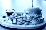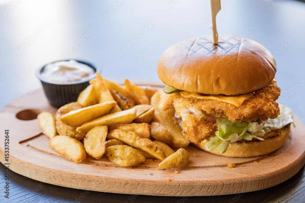 hamburger with fries. fast food. wonderful and juicy burger with fresh vegetables, cheese and yellow cheese. fried potatoes and favorite sauce.