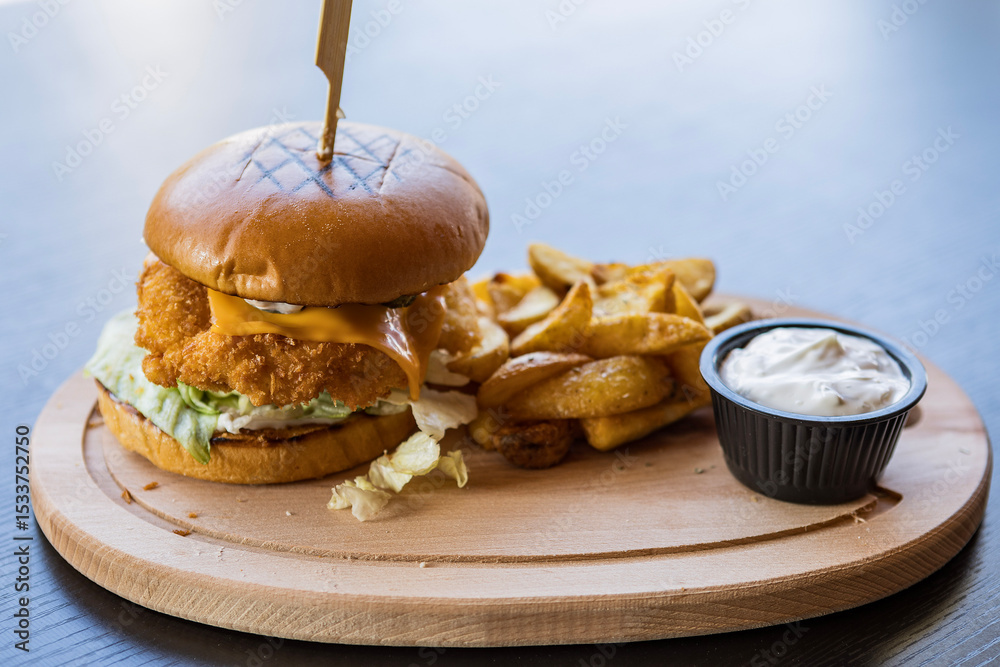 hamburger with fries. fast food. wonderful and juicy burger with fresh vegetables, cheese and yellow cheese. fried potatoes and favorite sauce.