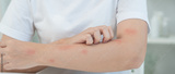 skin problem and beauty. Young woman scratch body has itchy skin from skin allergic, steroid allergy, sensitive skin, red from sunburn, chemical allergy, rash, insect bites, Seborrheic Dermatitis.