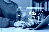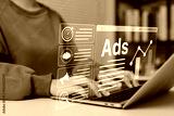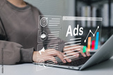 Digital Marketing and Online Advertising Strategy Concept. A person using laptop with advertising icons, performance metrics, audience targeting, and campaign strategy analytics for online marketing.