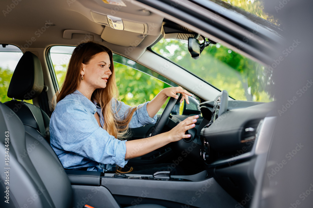 A confident young woman driving a car. Test-driving a new car or traveling.