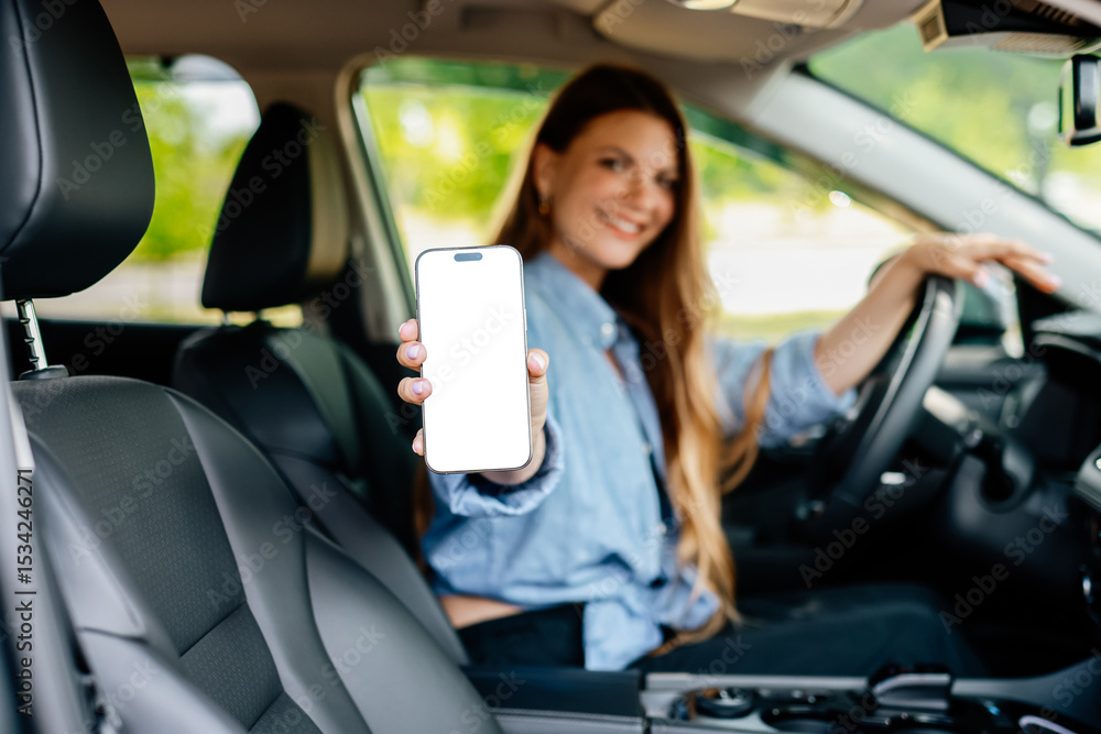 Happy woman demonstrates smartphone with white screen while sitting in car. Smiling woman showing a place to copy a mobile ad or website.