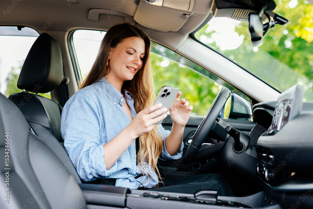 Cute girl driver uses cell phone in her modern car. Concept of leisure, travel, technology, navigation.