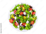 plate of salad with fresh vegetables and feta cheese isolated on transparent background, top view