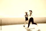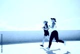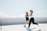Women Running Together in Bright Sunlight on a Rooftop Overlooking a Vibrant City, Embodying Friendship and Fitness on a Clear Day