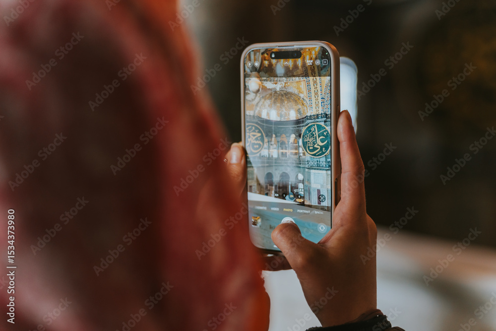 Muslim woman photographing the green dome of the prophet's mosque with smartphone