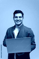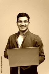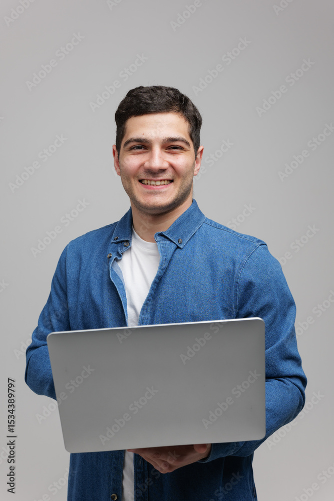Smiling Young Man Presents a Laptop While Wearing a Denim Jacket Against a Neutral Background, Reflecting Confidence and Approachability