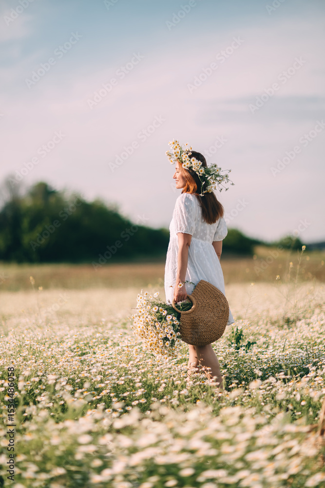 Daisy Field Woman Summer, girl walking through flower field during sunny summer day to enjoy nature