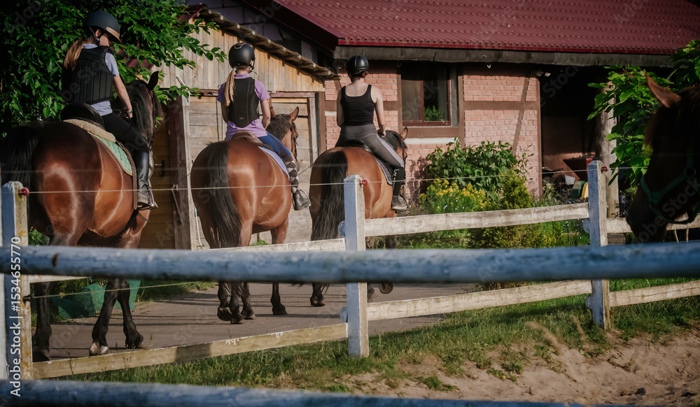 Grupa młodych ludzi wyjeżdża ze stajni w teren na koniach po letnią wakacyjną przygodę podcdzas sportowego obozu konnego dla dzieci i młodzieży nad morzem. Niezapomniane wakacje w siodle i hipoterapia