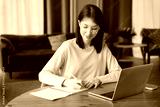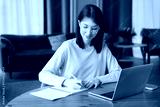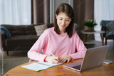 Engaging in Productive Study Session at Home With a Laptop and Notepad on a Cozy Wooden Table
