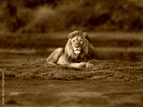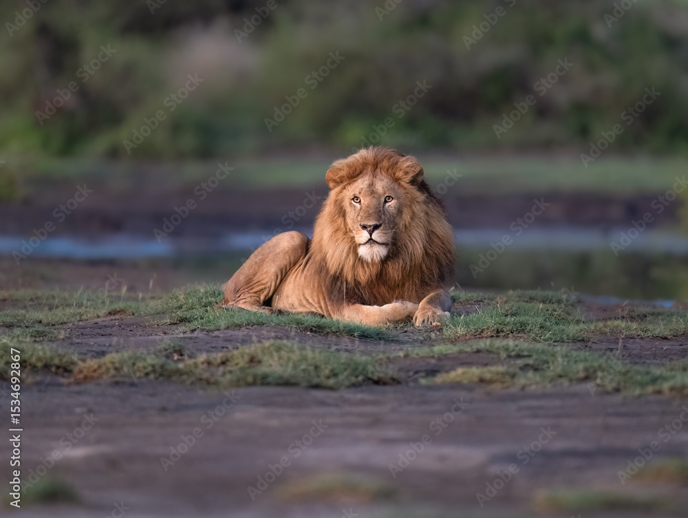 Male Lion Resting on Grassland Near Waterhole