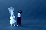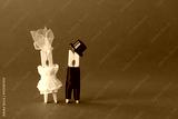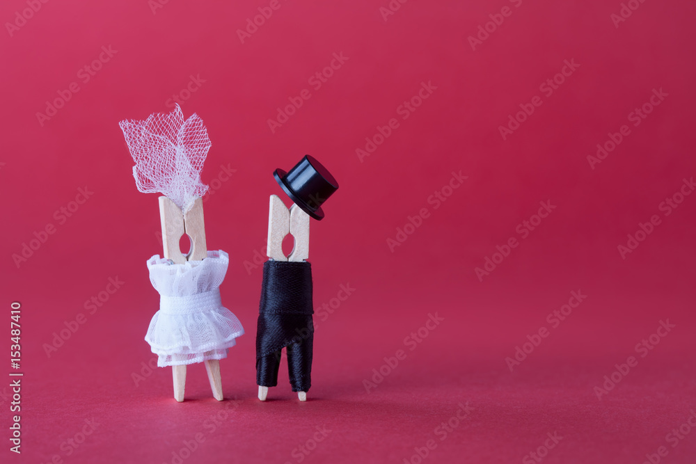 Bride groom wedding invitation card template. Clothespin characters in love. Pink violet paper background copy space. Abstract woman in white dress, man black suit hat. Macro view, selective focus.