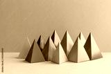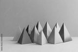 Colorful abstract geometric figures still life. Three-dimensional pyramid prism rectangular cube on orange background. Yellow blue pink green violet red colored objects.