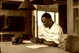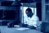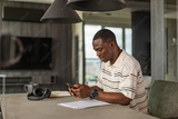 Successful african financier investor works inside home office, businessman in business uses telephone, man smiles and reads good news online from smartphone.