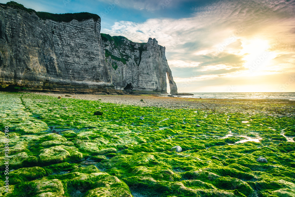 Magnificent mossy beach and spectacular sunset near Etretat, Normandy, France