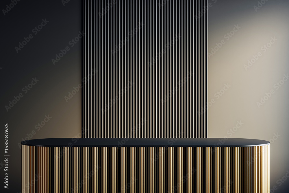 Luxury modern podium with vertical gold lines and black top surface in elegant interior studio with soft lighting and shadow accents for product display. 3D Rendering