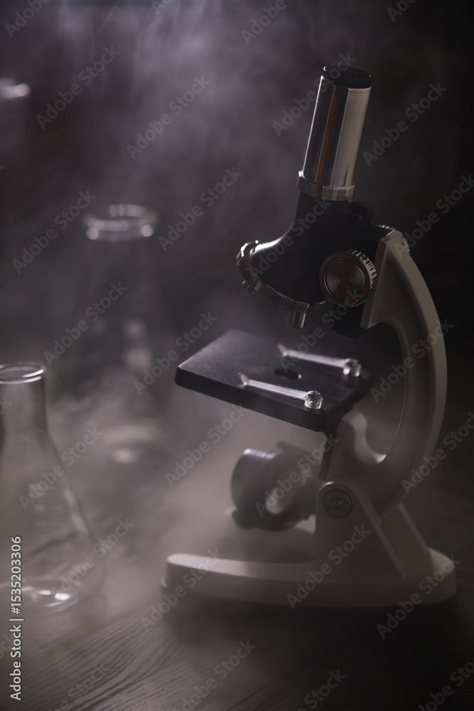Vintage Microscope and Laboratory Glassware in Mysterious Smoke Setting