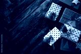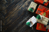 Festive Christmas Gifts Wrapped with Decorative Paper on Wooden Floor