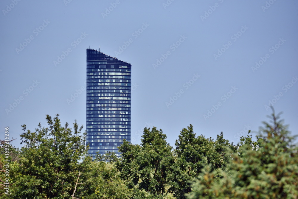 Highest skyscraper in Wroclaw city, Poland. Building surrounded by green trees.