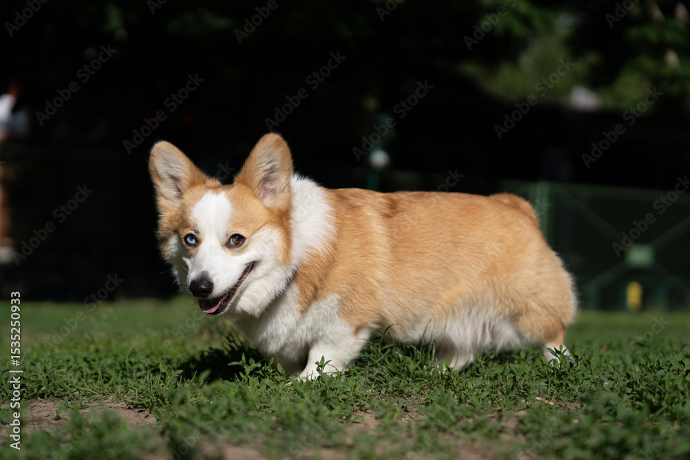 A Welsh Corgi dog under soft golden sunlight during a walk, looking content and relaxed.