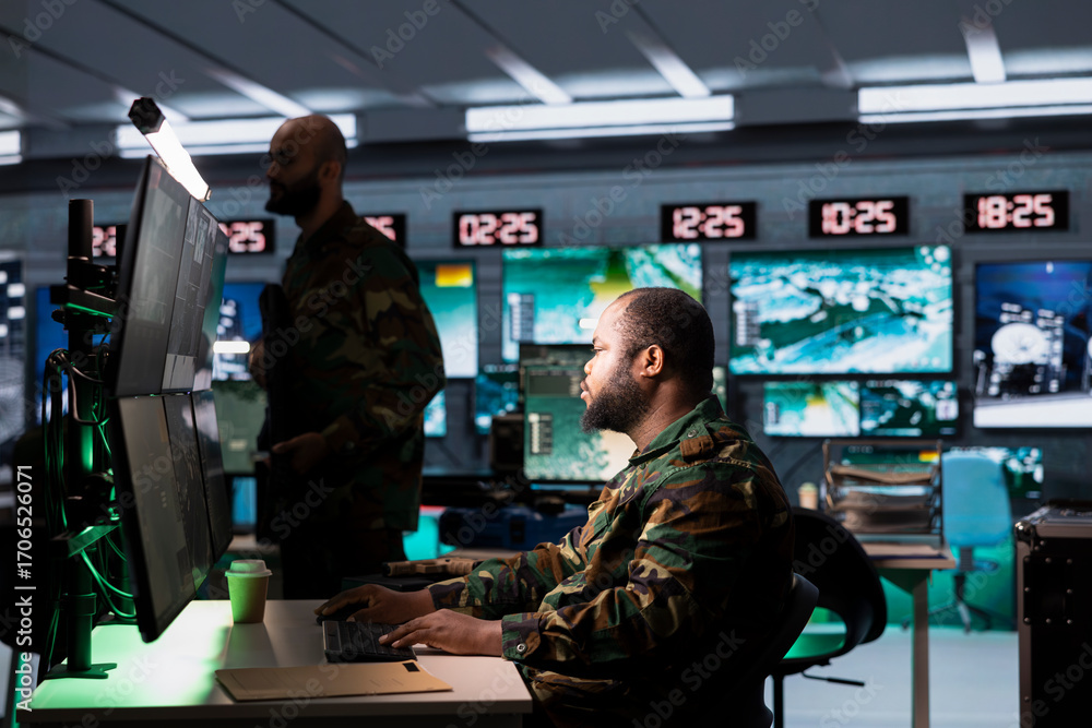 Automated manufacturing plant specialist analyzing live production data, using headset mic to communicate insights to engineers about robotic arms, conveyor belts and photovoltaic systems, camera B