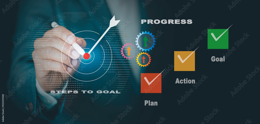 Steps to goal achieved progress concept. achievement process.Checklist, Workflow Process for Quality Assurance completion, Business action plan, Management, and tracking strategies