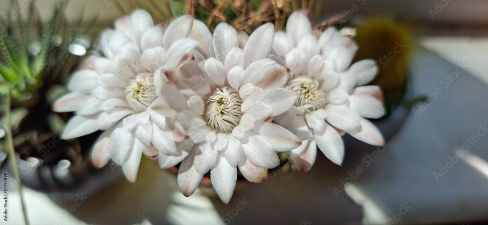 White, delicate flowers bloom in the center, surrounded by green and yellow cacti. They have layered petals and a textured center, with soft light casting shadows around them