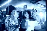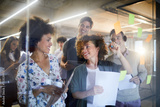 Group of diverse coworkers brainstorming ideas with sticky notes on glass wall