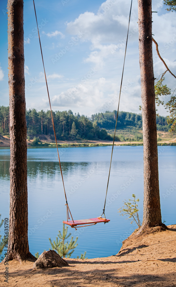 empty wooden swing in beautiful nature in the forest by the lake for relaxation natural therapy.