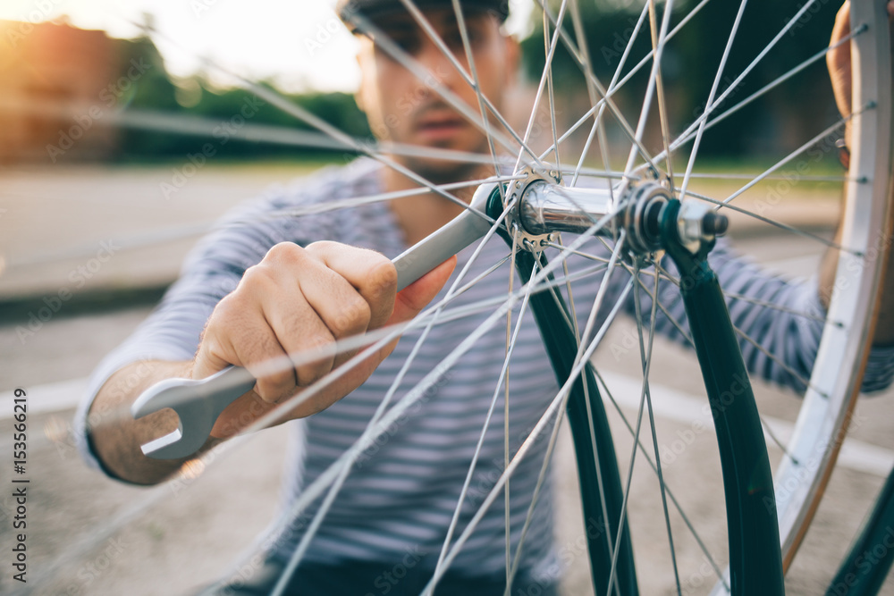 Man tightening wheel on bicycle