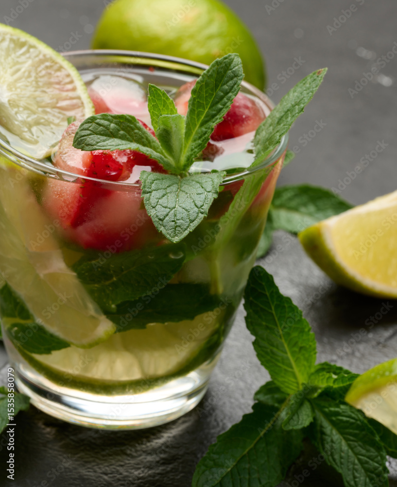 Refreshing mojito cocktail with lime, mint, strawberry, and ice on dark background