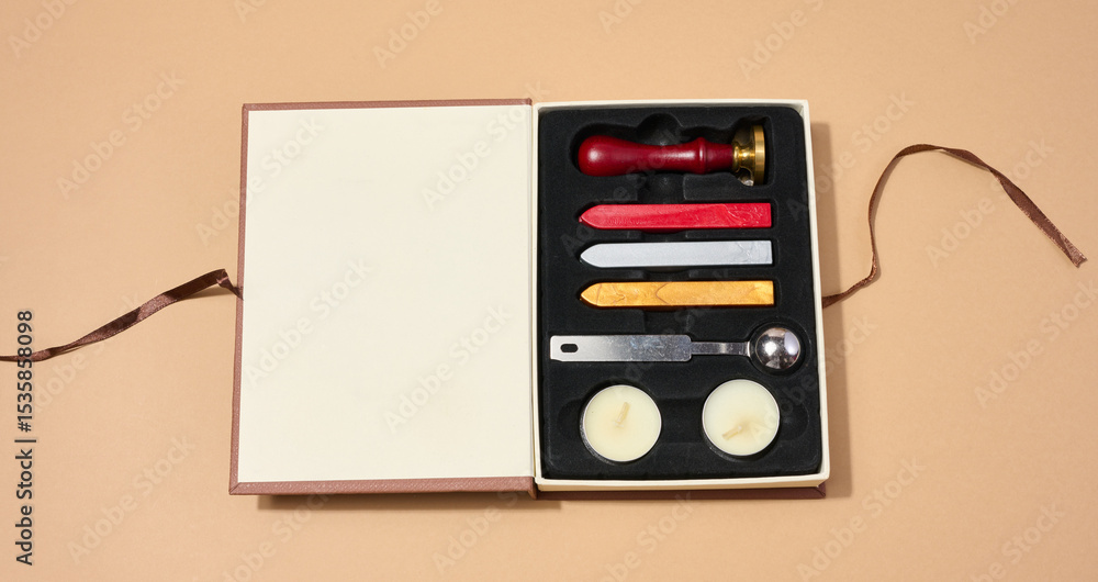 A wax seal kit including wax sticks, spoon, candles, stamp and sealed scroll placed on a neutral background
