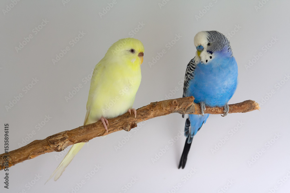 Two budgerigars sits on a branch