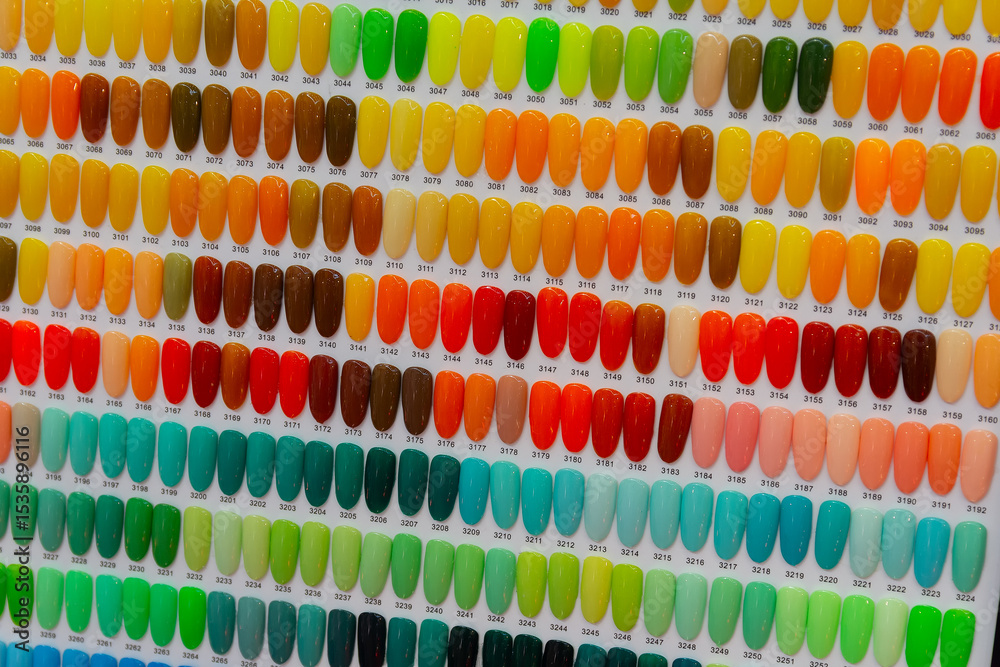 Set of many colorful palletes of gel nail polishes on counter of make up