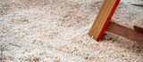 Sawdust heap under workbench leg in the wood workshop. Wooden dust from planing and sawing timber. Wood production waste. lumber industry concept
