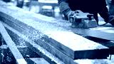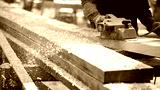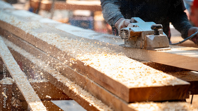 Male carpenter hand using an electric planer on wooden plank at construction site. Woodworker planing timber in his workshop with sawdust spreading around. Lumber industry and carpentry work tool