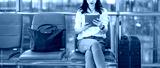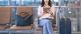 Adult freelancer woman using tablet luggage boarding plane global business trip work travel at international airport terminal departure platform
