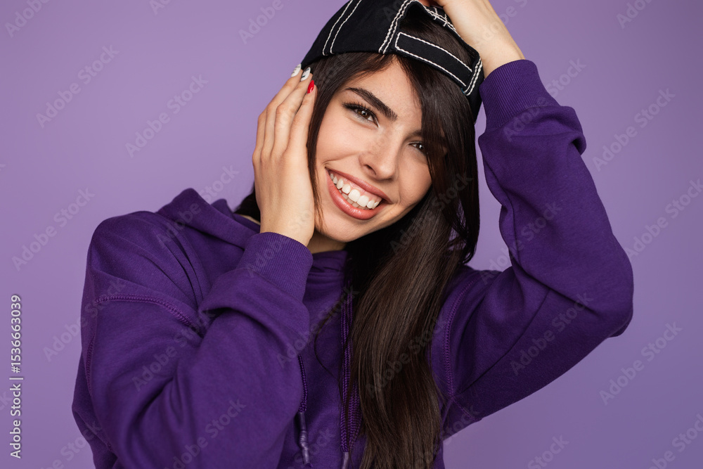 Cheerful young woman wearing a purple hoodie and a hat, posing playfully and smiling brightly against a matching purple background.