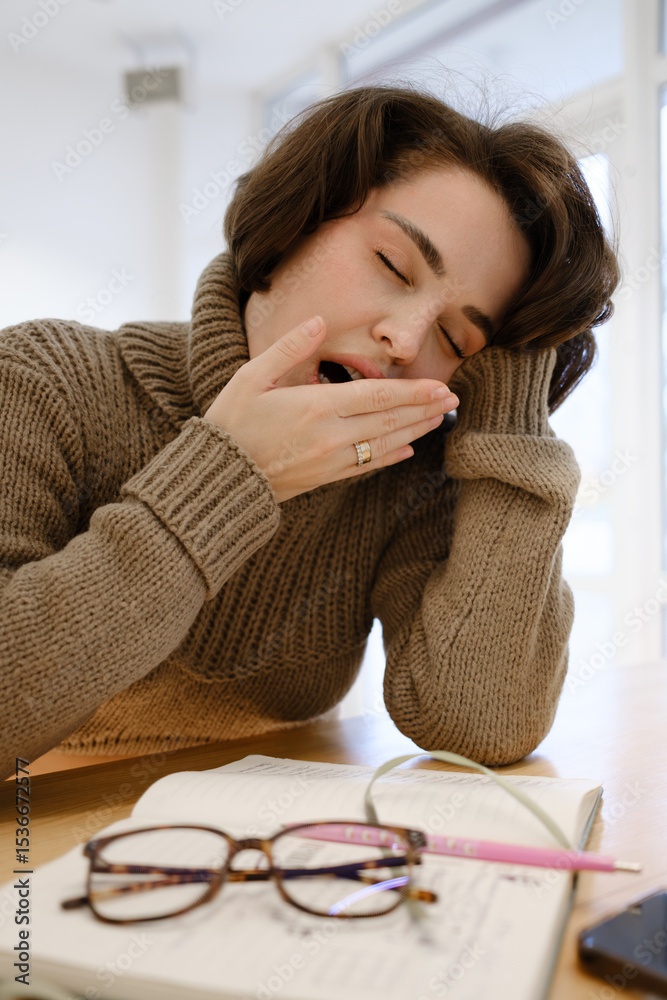 Woman yawning, feeling sleepy while at her desk with study materials.