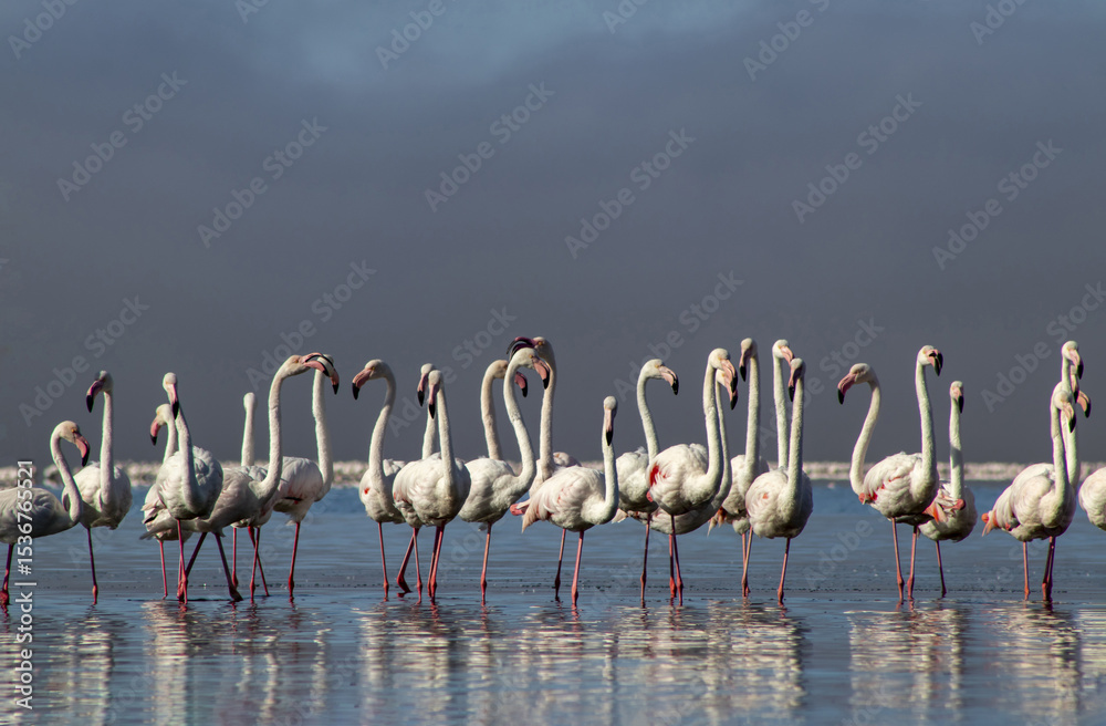 Flock of flamingos strolling through a reflective lagoon under a radiant African sky. Authentic wildlife scene from Namibia, ideal for nature, birdwatching, and travel content.