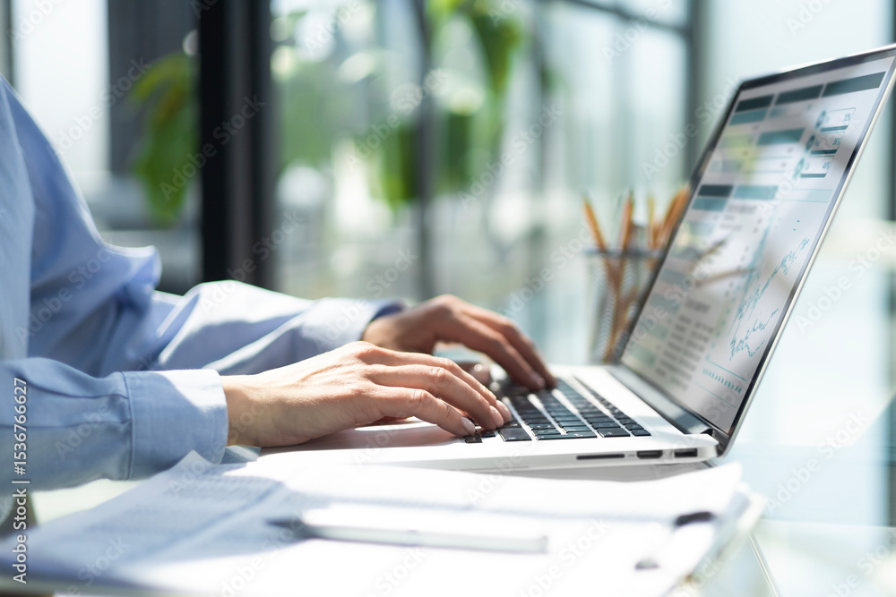 womans hands analyzing financial data on laptop screen in hybrid office setting for digital entrepreneurship