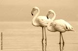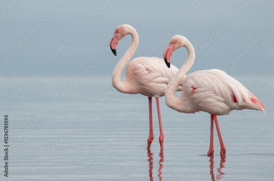 A pair of flamingos wading in an African lagoon, reflecting in calm water. Real wildlife scene from Namibia, ideal for nature lovers, exotic bird content, and editorial use.