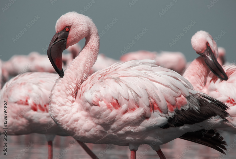 Flock of flamingos strolling through a reflective lagoon under a radiant African sky. Authentic wildlife scene from Namibia, ideal for nature, birdwatching, and travel content.