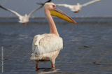 A solitary great white pelican standing still in shallow water in Namibia, captured in soft natural light. Ideal for wildlife, birdwatching, travel, and African nature themes.