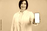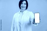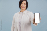 Smiling businesswoman showing smartphone with blank screen on blue background