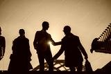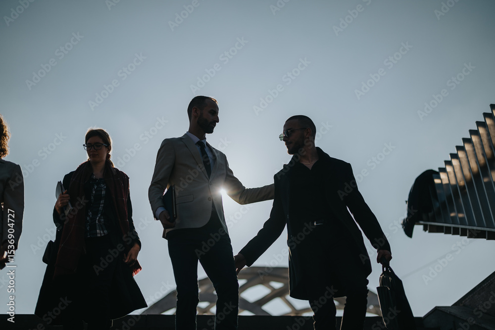 A group of professional individuals walking outdoors, collaborating during sunset.