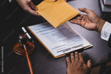 Lawyer receiving envelope with money for bribery. Corrupt lawyer receiving a bribe in an office, showcasing unethical behavior in law and finance. Hands accept money envelope.