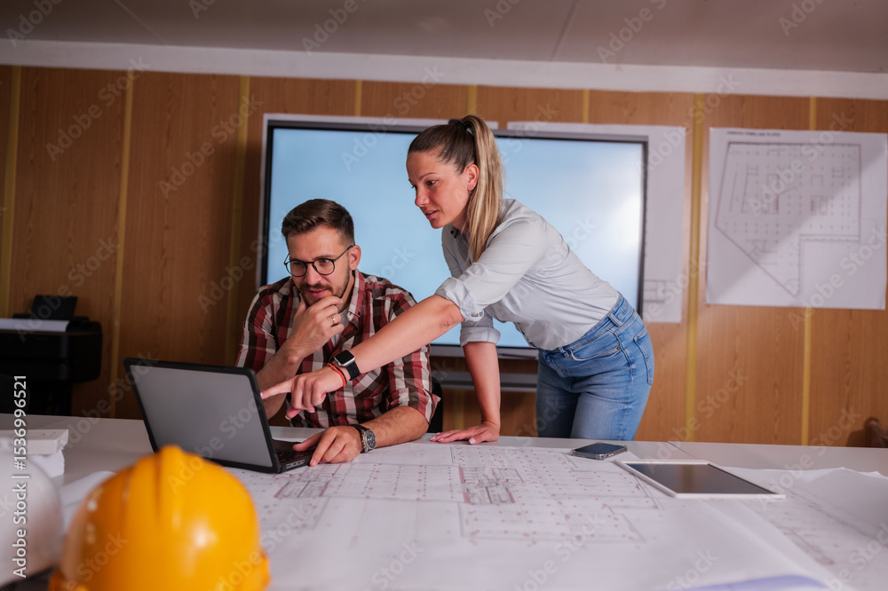 Two architects are collaborating on a project, examining blueprints and using a laptop in their office, showcasing teamwork and expertise in architectural design