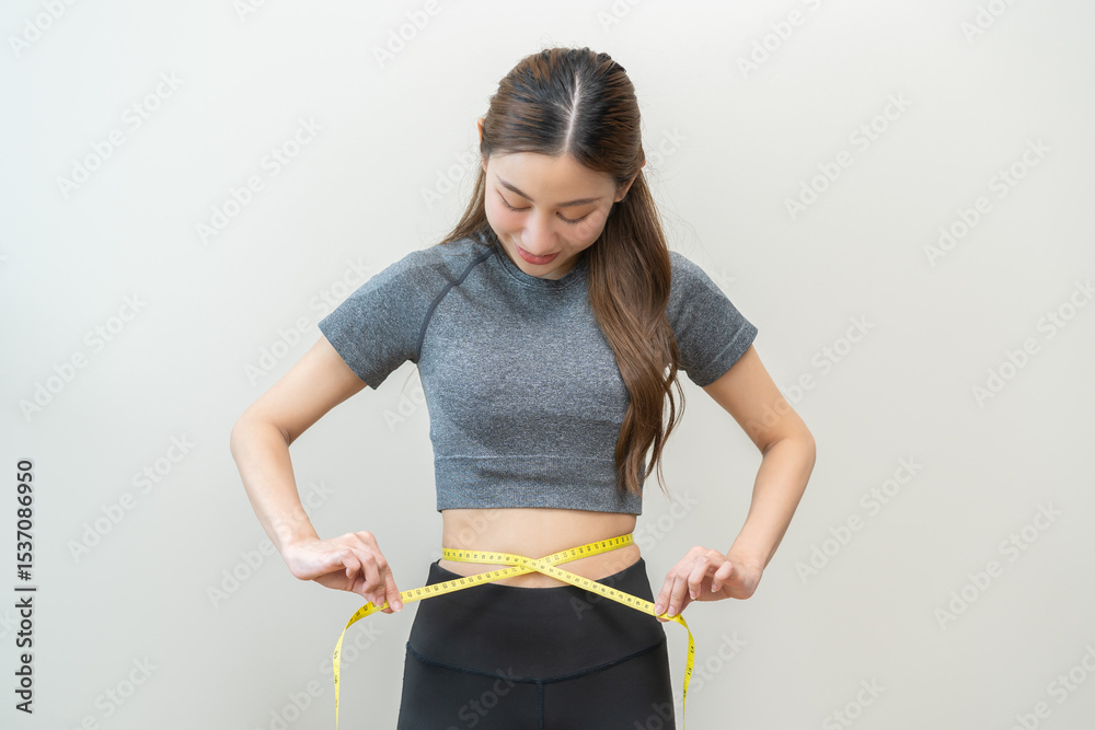 Diet, slim shape asian young woman, female standing, hand using measure tape around waist, body. Happy girl slim slender isolated on background. Diet session for wellbeing health, eat good food people